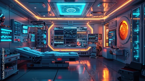 © Waraporn, Fototapeta premium Futuristic Digital Control Panel of Sleek High Tech Spacecraft Cockpit Interface with Numerous Screens Displays Lighting and Advanced Technology for a Sci Fi Cyberpunk or Futuristic Concept