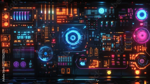 Obraz premium Futuristic digital control panel with vibrant neon elements and glowing...