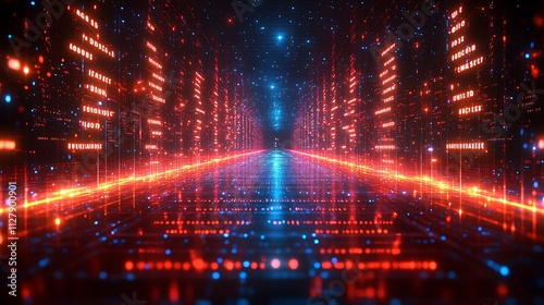 Obraz premium Futuristic digital corridor with red and blue glowing lines.