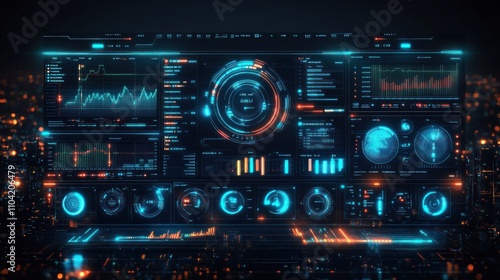 Obraz premium Futuristic digital dashboard displaying data analytics and metrics.