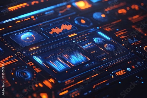 © Hasniah, Obraz premium Futuristic digital dashboard displays data metrics in a modern control panel