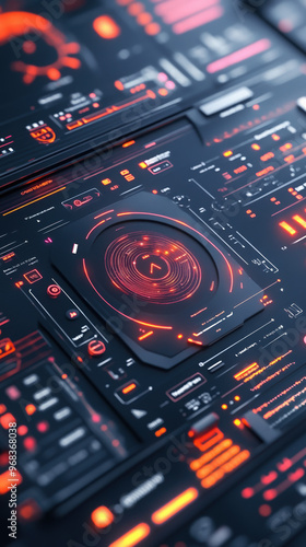 © Isaiah, Fototapeta premium Futuristic Digital Dashboard Interface: High-Tech Visualization Software with Neon Graphics, Interactive User Controls, Abstract Patterns, and Modern Aesthetic Design Elements in Red, Black, and Blue