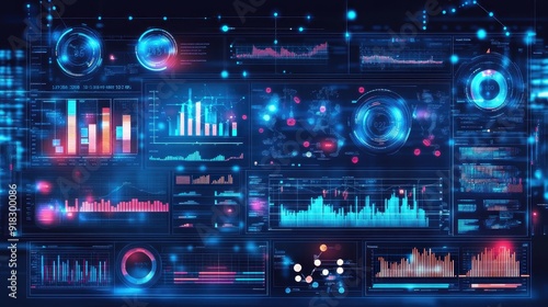 © Rattanathip, Obraz premium Futuristic digital dashboard interface with dynamic data visualizations, charts, and graphs, showcasing big data analytics in high tech design.