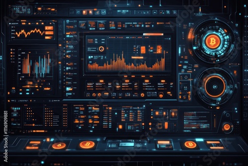 Obraz premium Futuristic digital dashboard with cryptocurrency data, charts, and graphs.