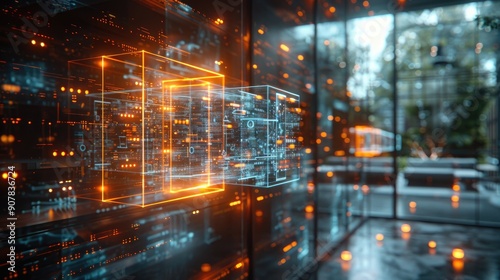Fototapeta premium Futuristic digital data interface with glowing holographic displays and high-tech environment, representing modern technology and innovation.