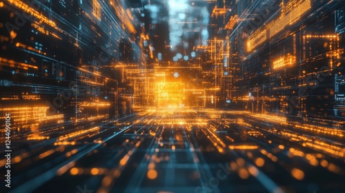 © Elena, Obraz premium Futuristic digital data network with glowing orange and blue lights