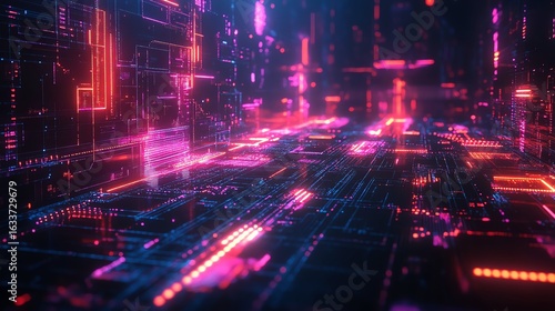 Fototapeta premium Futuristic Digital Data Network with Neon Pink and Blue Circuitry in High...