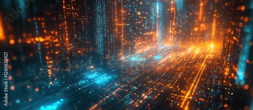 © Sunshine, Naklejka premium Futuristic Digital Data Stream with Glowing Orange and Blue Lights in a Virtual Cyber Space Environment