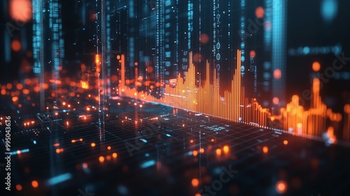 © Tackey, Fototapeta premium Futuristic digital data visualization with glowing graphs and binary code elements, representing advanced analytics.