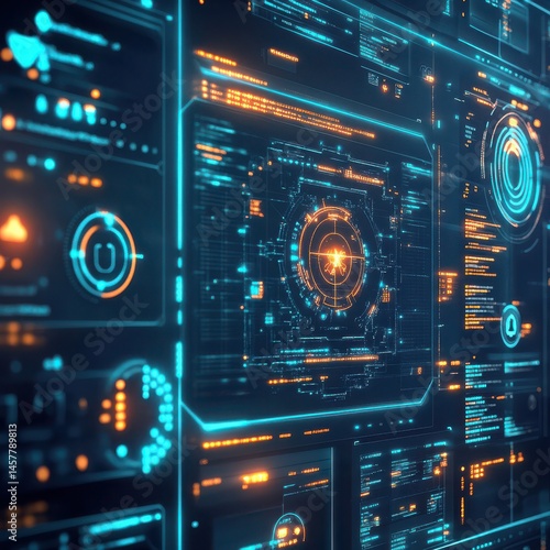 © watchirachat, Obraz premium Futuristic digital display interface technology lab hyperrealistic visualization dark environment close-up viewpoint