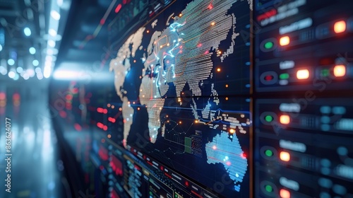 Obraz premium Futuristic digital display showcasing global network data visualization in a modern control room with vibrant lights and high-tech interface.