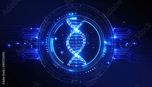 Obraz premium Futuristic Digital DNA Helix with Bright Blue Glowing Effects and High-Tech Interface Elements