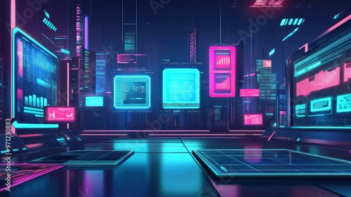Obraz premium Futuristic digital environment with vibrant screens displaying data and graphs.