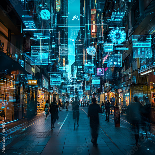 © thanit, Obraz premium Futuristic digital experience urban alley visual art neon environment street level viewpoint technology concepts