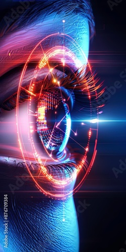 Obraz premium Futuristic digital eye close-up with holographic interface and glowing...