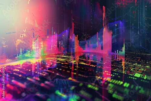 Fototapeta premium Futuristic digital financial data visualization with colorful graphs and charts. Modern abstract representation of market analytics and technology.