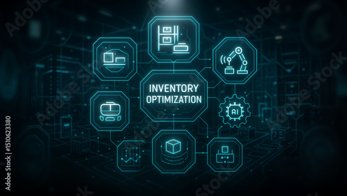 Obraz premium Futuristic digital graphic illustrating inventory optimization with interconnected icons representing AI, automation, and logistics in a sci-fi environment.