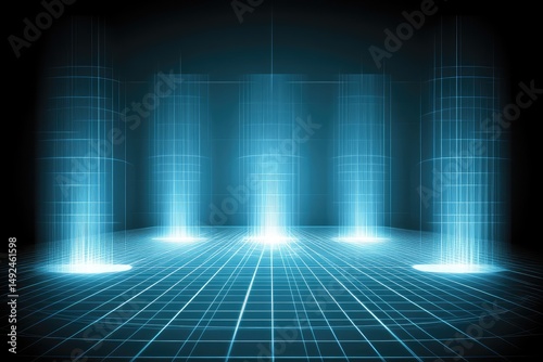 Fototapeta premium Futuristic, digital grid floor with light beams