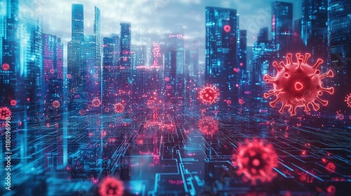 Obraz premium futuristic digital grid overlaid with Human metapneumovirus Virus hmpv particles glowing in neon red and blue representing the spread of hmpv through hightech cityscape