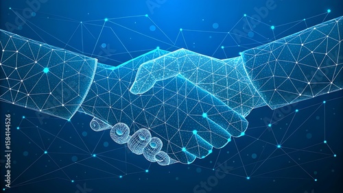 Obraz premium Futuristic digital handshake composed of polygonal lines, dots, and triangles...
