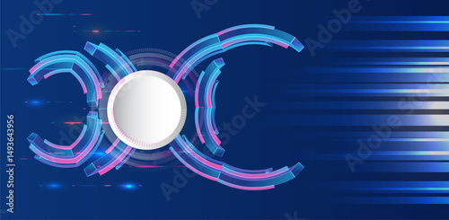 © arthead, Fototapeta premium Futuristic digital interface background with colorful circular tech elements and motion blur lines on a dark blue backdrop. Perfect for presentations, UI/UX concepts, and technology-themed designs.