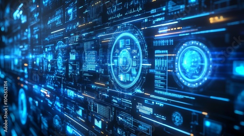 Fototapeta premium Futuristic Digital Interface Blue Glowing HUD with Data Analytics and...