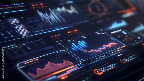 Obraz premium Futuristic Digital Interface: Complex data visualizations illuminate a sleek, high-tech interface, representing modern technology and data analysis