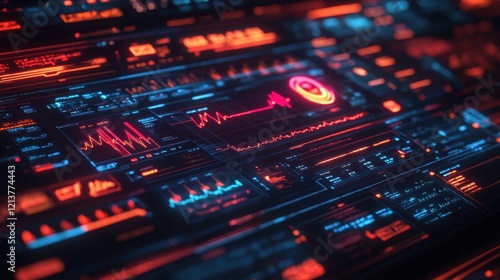 © patungkead, Obraz premium Futuristic Digital Interface Display with Red and Blue Neon Glowing Data Graphs Charts