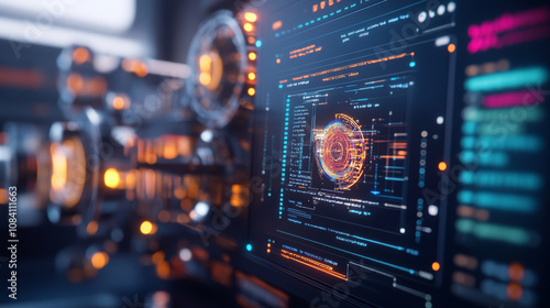 Obraz premium Futuristic digital interface displaying complex data visualizations and glowing elements, showcasing advanced technology and innovation in high tech environment