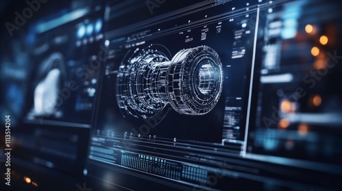 Obraz premium Futuristic digital interface displaying complex technical blueprint of a mechanical component.