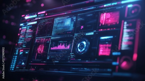 Fototapeta premium Futuristic digital interface displaying data analytics and visualizations in...
