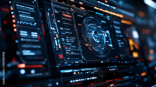 Obraz premium Futuristic digital interface displaying data analytics and visualizations,...