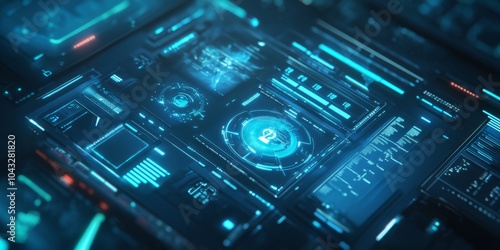 Obraz premium Futuristic digital interface displaying data visualizations and analytics in...