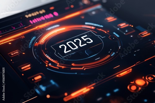 Obraz premium Futuristic digital interface displaying the year 2025 with vibrant graphical...