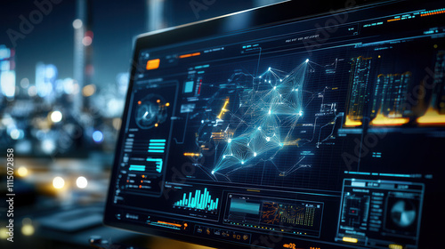 © Worakit, Obraz premium futuristic digital interface displays energy flow, grid data, and analytics in cityscape