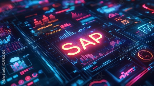 Obraz premium Futuristic digital interface featuring glowing text and vibrant design elements for technology and innovation themes.