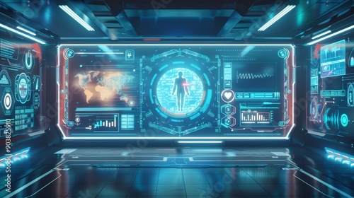 Obraz premium Futuristic digital interface showcasing a human silhouette surrounded by data visualizations and charts in a sleek, high-tech environment.