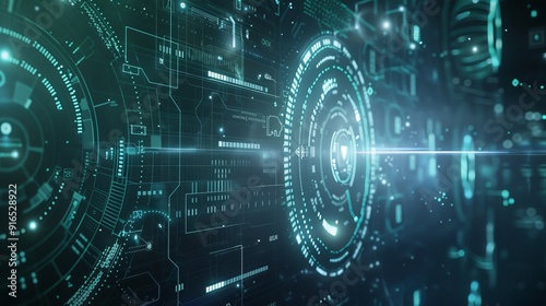 Obraz premium Futuristic digital interface showcasing detailed technological elements and intricate circular data displays, predominantly in green tones, conveying innovation.