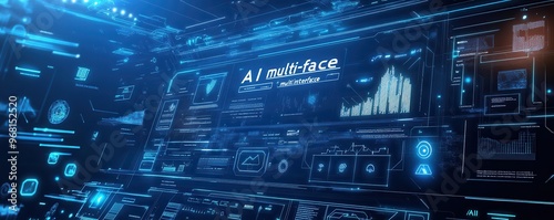 Fototapeta premium Futuristic digital interface with blue technological graphics showcasing AI advancements and data analysis