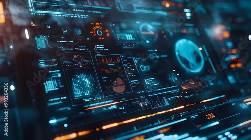 © Jojo*, Obraz premium Futuristic Digital Interface with Data Visualizations and a Global Map