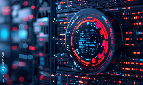 © Surachate, Obraz premium Futuristic Digital Interface with Globe and Data Patterns for Technology