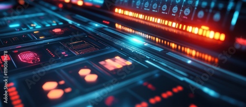 Fototapeta premium Futuristic digital interface with glowing blue and orange data streams.