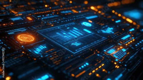 Fototapeta premium Futuristic digital interface with glowing blue and orange elements,...