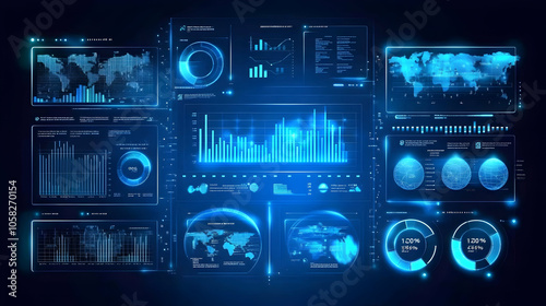 Obraz premium Futuristic digital interface with glowing blue graphics and data visualizations.
