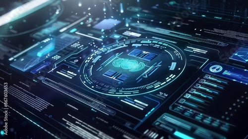 Obraz premium Futuristic digital interface with glowing blue lines and data streams....