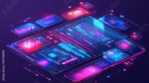 © Alienmarsh, Obraz premium Futuristic digital interface with glowing data dashboards and interactive elements.