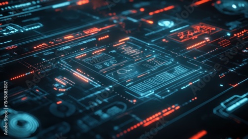 © suryanto, Obraz premium Futuristic digital interface with glowing data displays and complex circuitry.