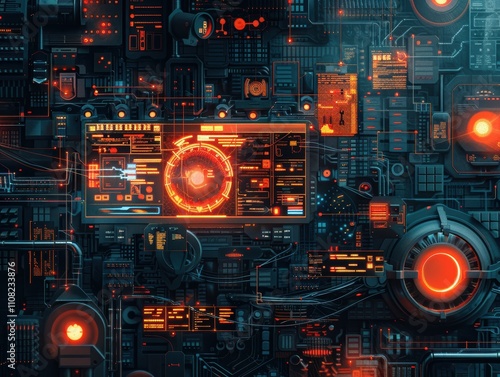 Obraz premium Futuristic digital interface with glowing elements and complex circuitry.