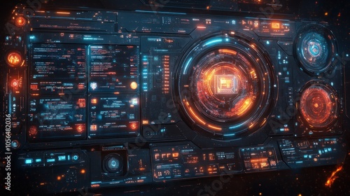 Obraz premium Futuristic digital interface with glowing elements and data displays.