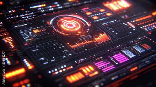 Obraz premium Futuristic digital interface with glowing elements. Complex display showing multiple data streams, controls, and indicators. Dynamic visuals showcasing technological advancements
